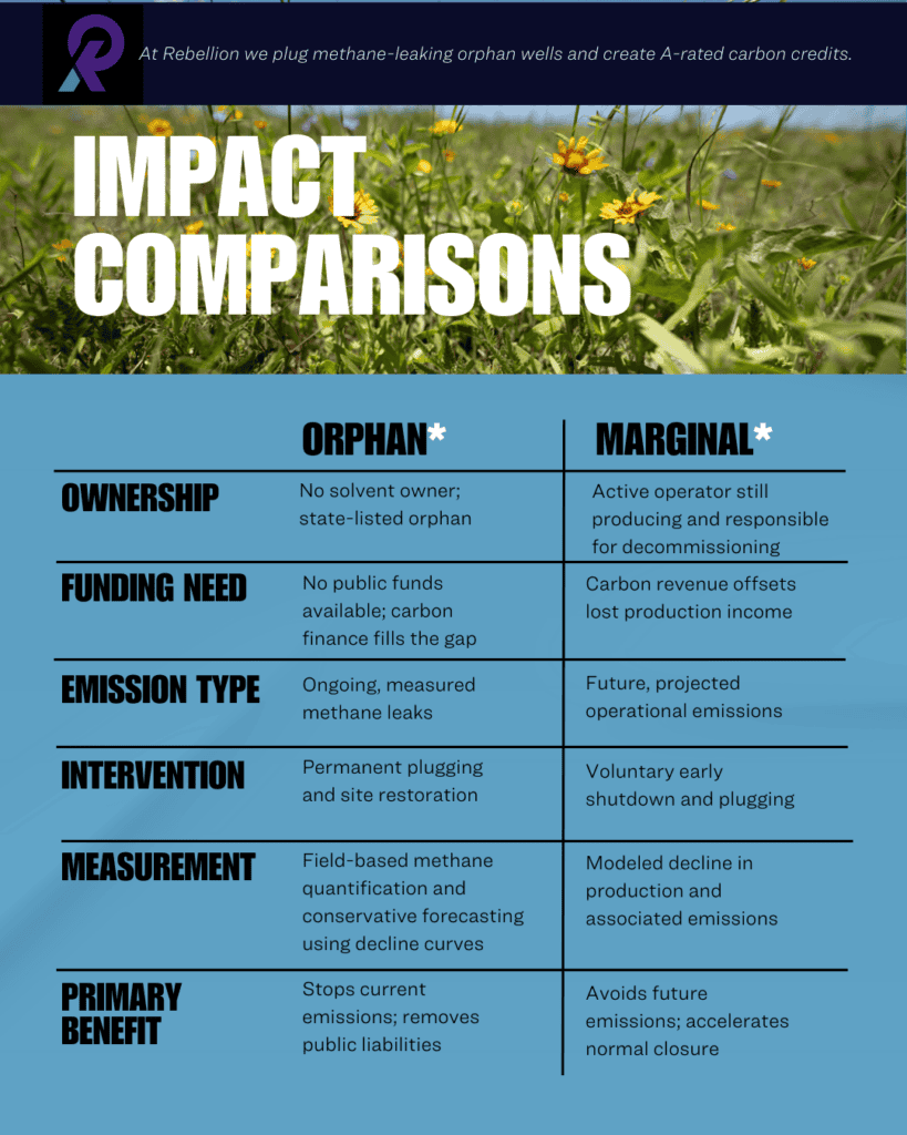 While these projects can help prevent future emissions, they do not address the ongoing emissions from already leaking orphan wells. Their financial model is also different: the operator participates voluntarily because carbon finance makes early closure economically feasible. In contrast, orphan wells have no operator and would remain unaddressed without private-sector involvement like Rebellion’s.